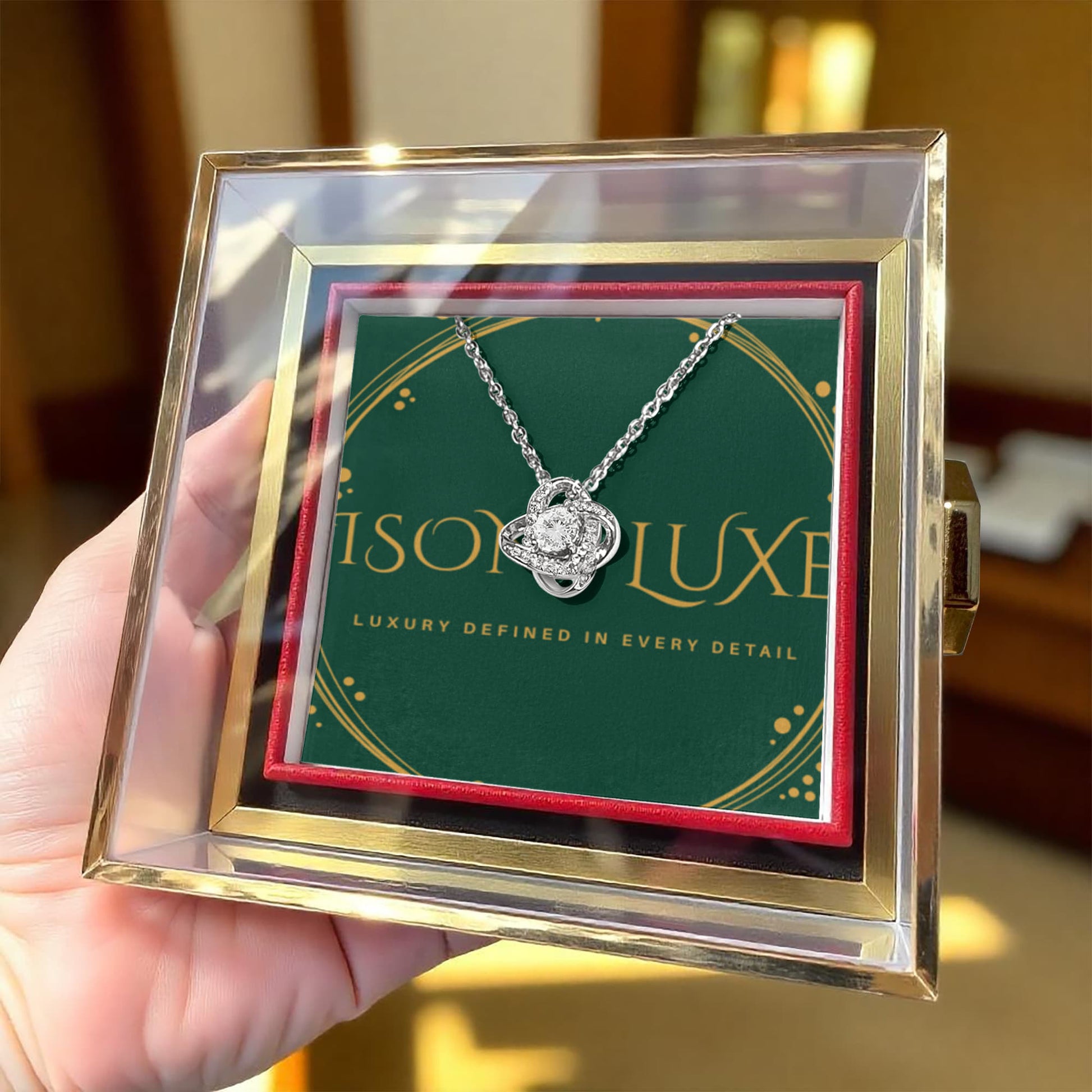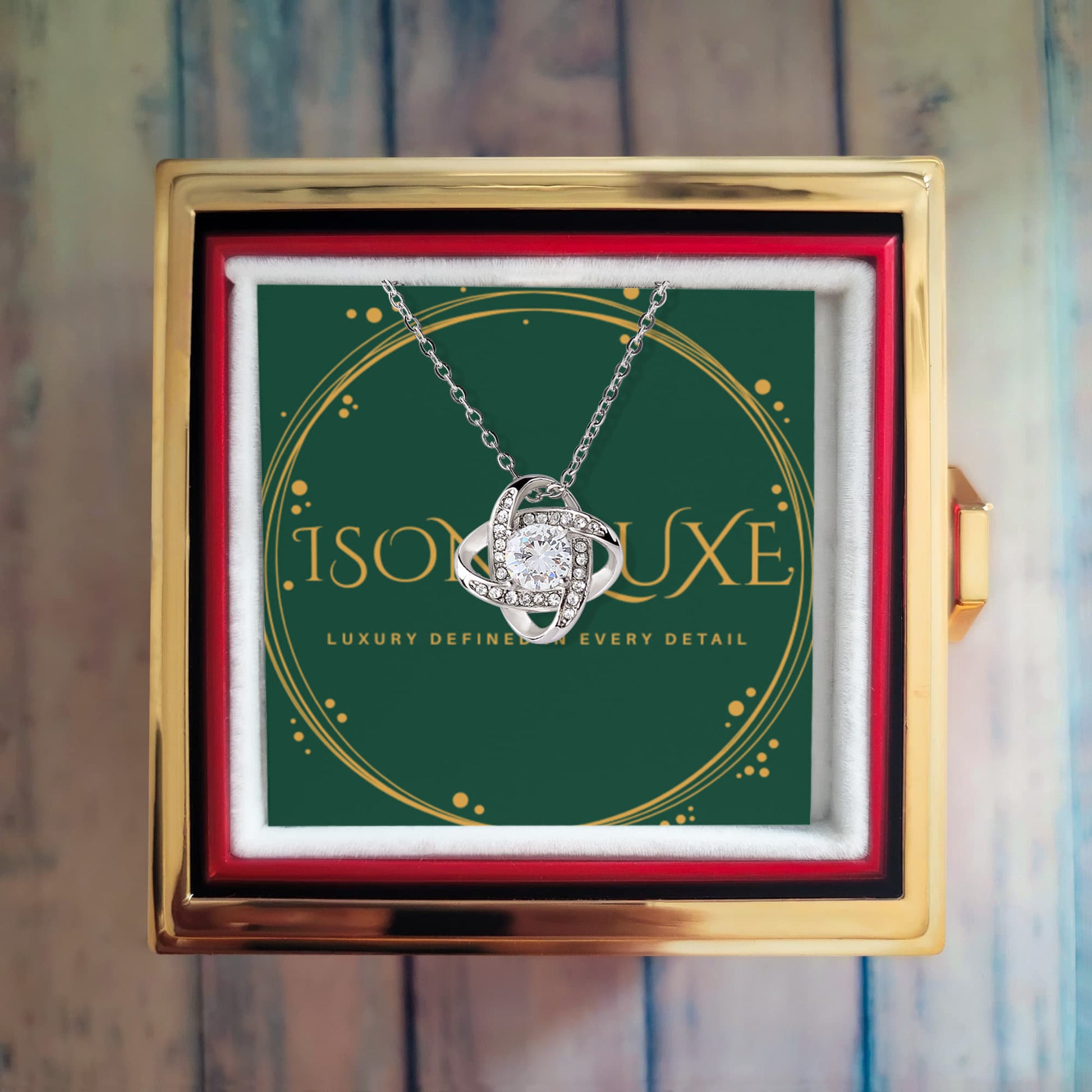 Imagine her reaction as she receives this beautiful Love Knot Necklace. Representing an unbreakable bond between two souls, this stunning pendant is adorned with premium cubic zirconia crystals, making it a timeless symbol of love and devotion. The luxurious box, featuring a meticulously preserved rose that never fades, adds an extra touch of love. With a simple turn of the gold knob, her breathtaking gift is revealed—making it the perfect sentimental gift for that special someone.